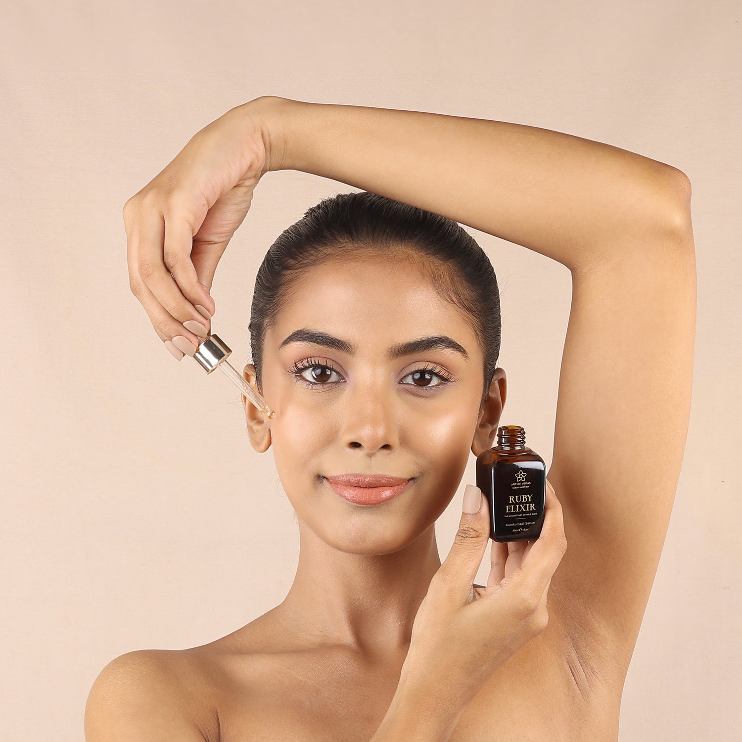 1. Ruby Elixir Kumkumadi Serum (30ml): Luksuzna mješavina šafrana i ayurvedskih biljaka za pojačavanje sjaja, poboljšanje teksture kože i poticanje ujednačenog tena.