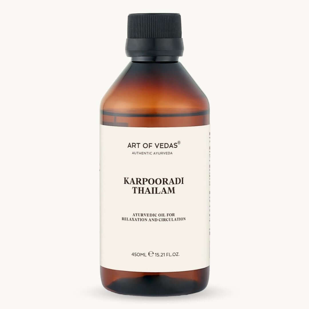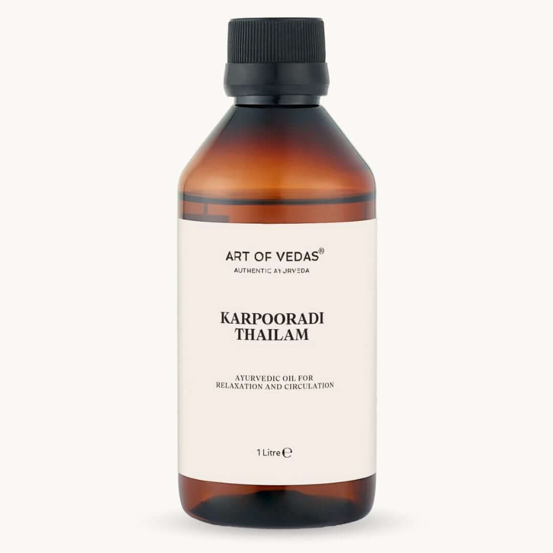 Karpooradi Thailam je klasično Ayurvedic ulje iz keralske tradicije, poznato po svojoj snažnoj zagrijavajućoj i prodirućoj akciji. Spomenuto u Bhaishajya Ratnavali i Sahasrayogam, ova tradicionalna formula kombinira samo dvije pažljivo odabrane biljke—Kampor (Karpura) i sjeme celera (Ajmoda)—u hranjivoj bazi sezamovog ulja.