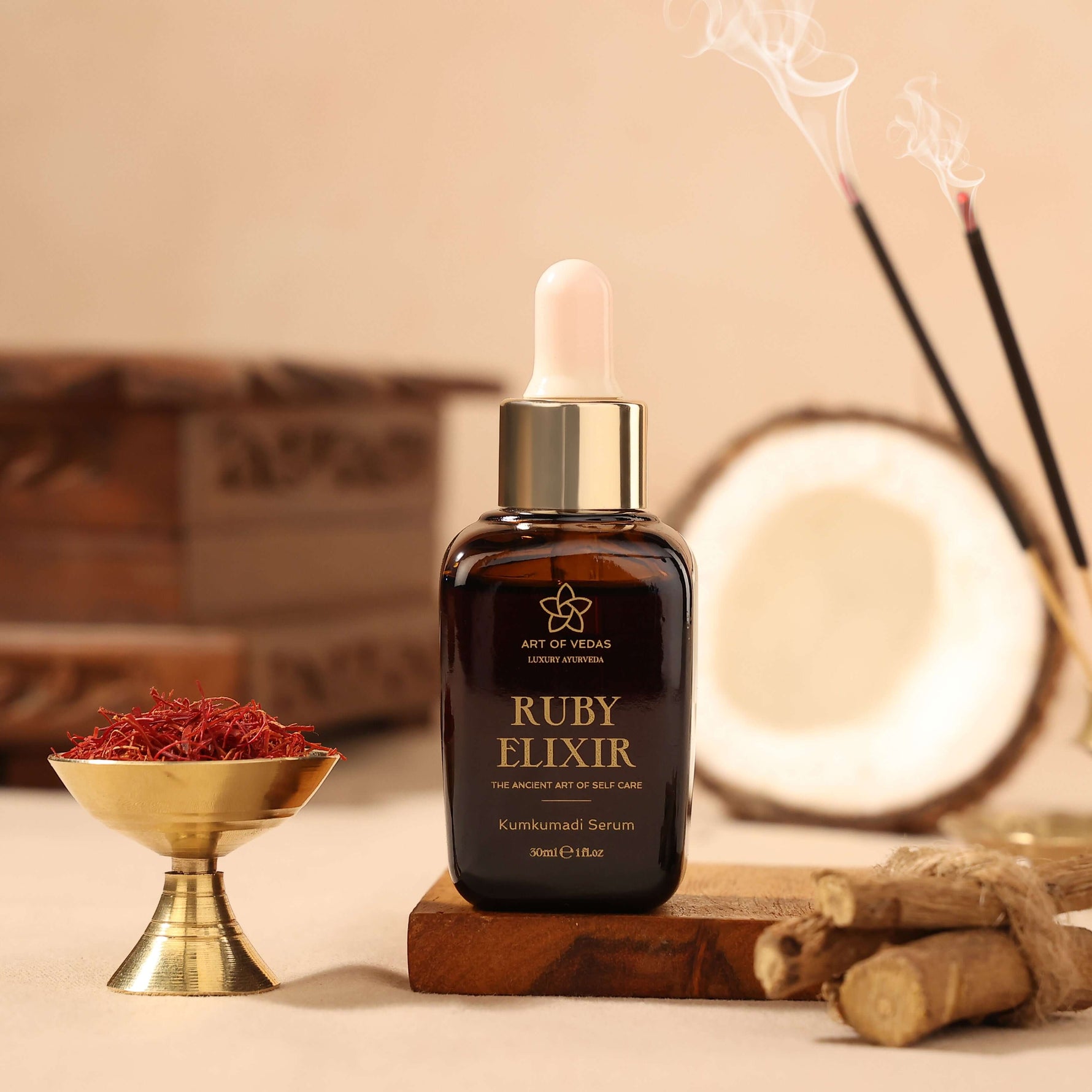 - Ruby Elixir Kumkumadi Serum (30ml): Luksuzna mješavina šafrana i ayurvedskih biljaka za pojačavanje sjaja, poboljšanje teksture kože i poticanje ujednačenog tena.