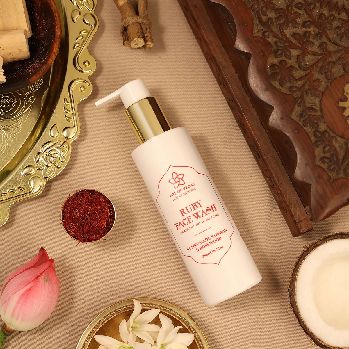 - Ruby Face Wash (150ml): Nježno sredstvo za čišćenje obogaćeno Kumkumadijem i šafranom za pročišćavanje kože uz zadržavanje njene prirodne vlage i sjaja.